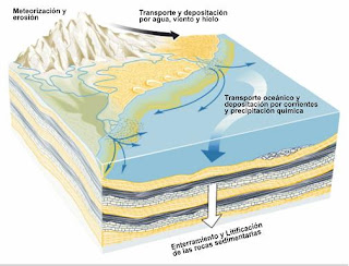 Todo esto conduce a la formación de material suelto(regolito) que es transportado desde las zonas topográficamente más elevadas hacia los sectores más bajos(cuencas), que en muchos casos son los fondos oceánicos y que reciben todo este material, depositándose para formar capas horizontales de sedimentos(estratos).